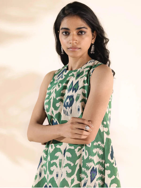 Twiffy Presents Ikat Floral Printed Sleeveless Co-ord Set with round neckline. Paired with elasticated waist pant.
