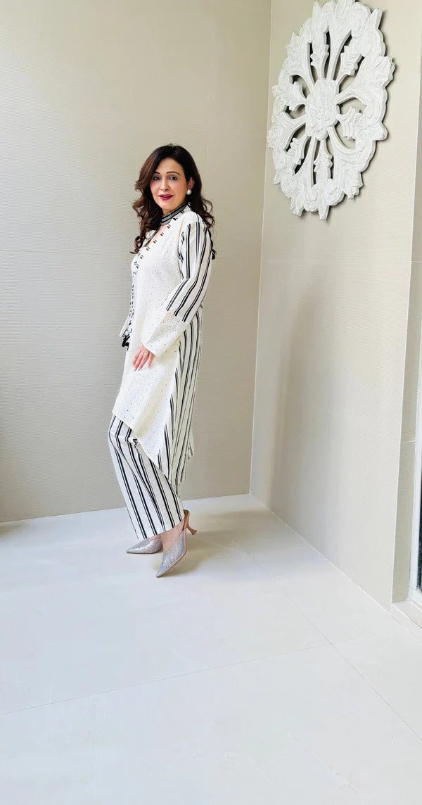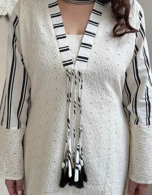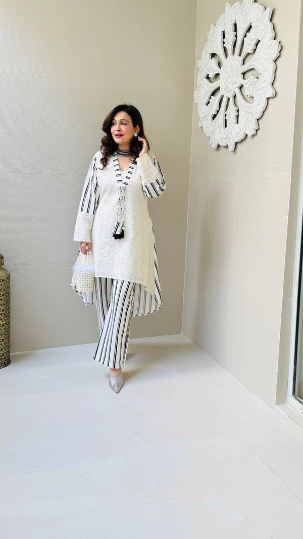 Elevate your style with our cord set crafted for effortless elegance and comfort. Made from breathable and lightweight Chifli fabric, this set features intricate cutwork detailing, giving it a chic and sophisticated look.