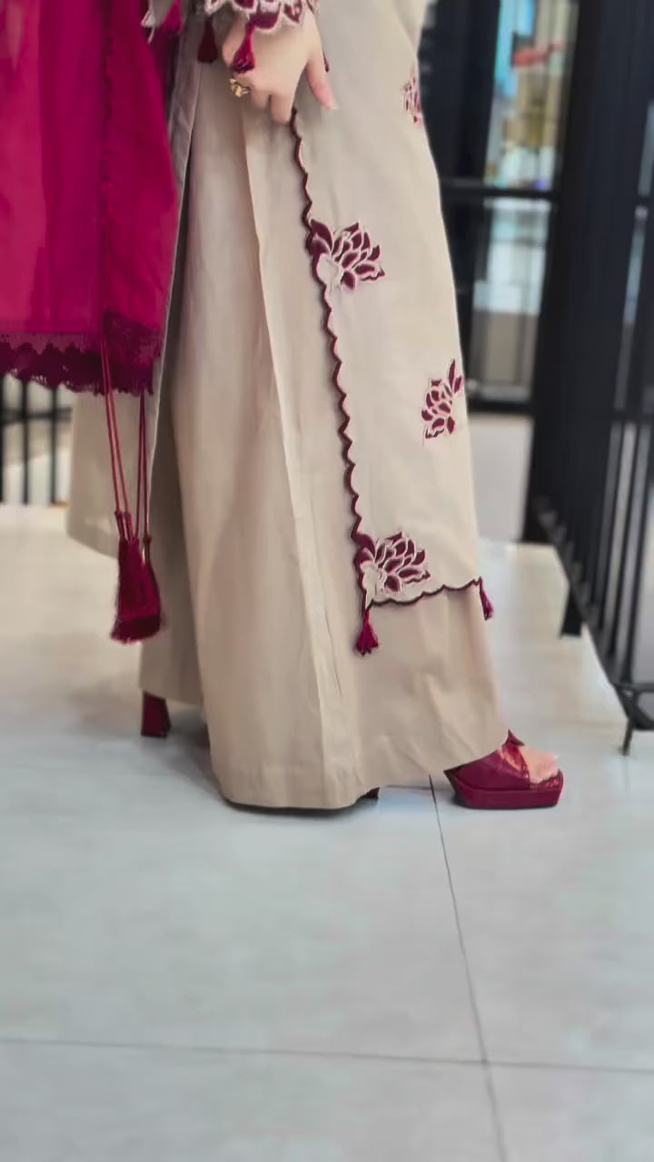 Hania Luxury Beige Embroidered Kurta Set with Rich Maroon Dupatta