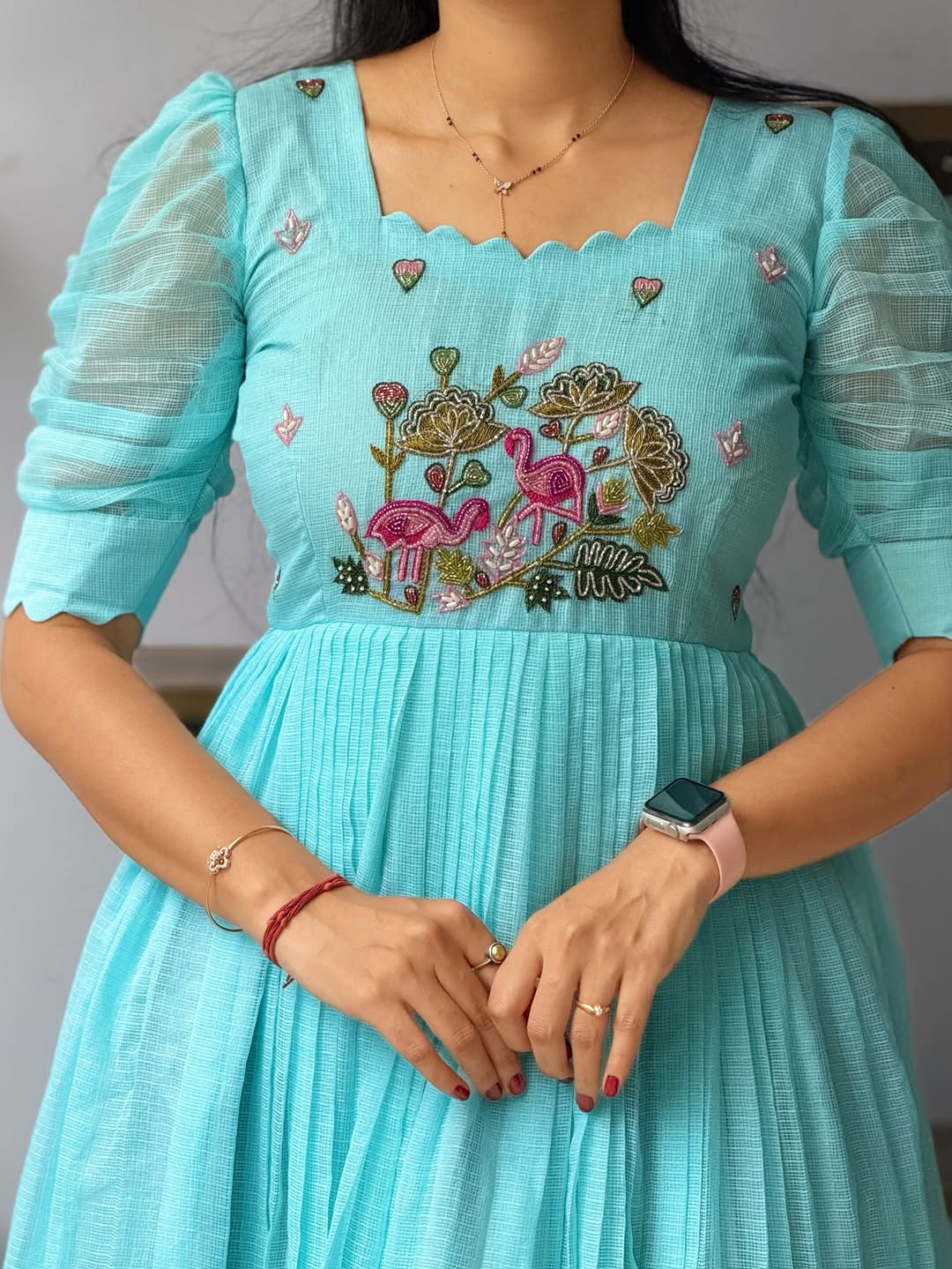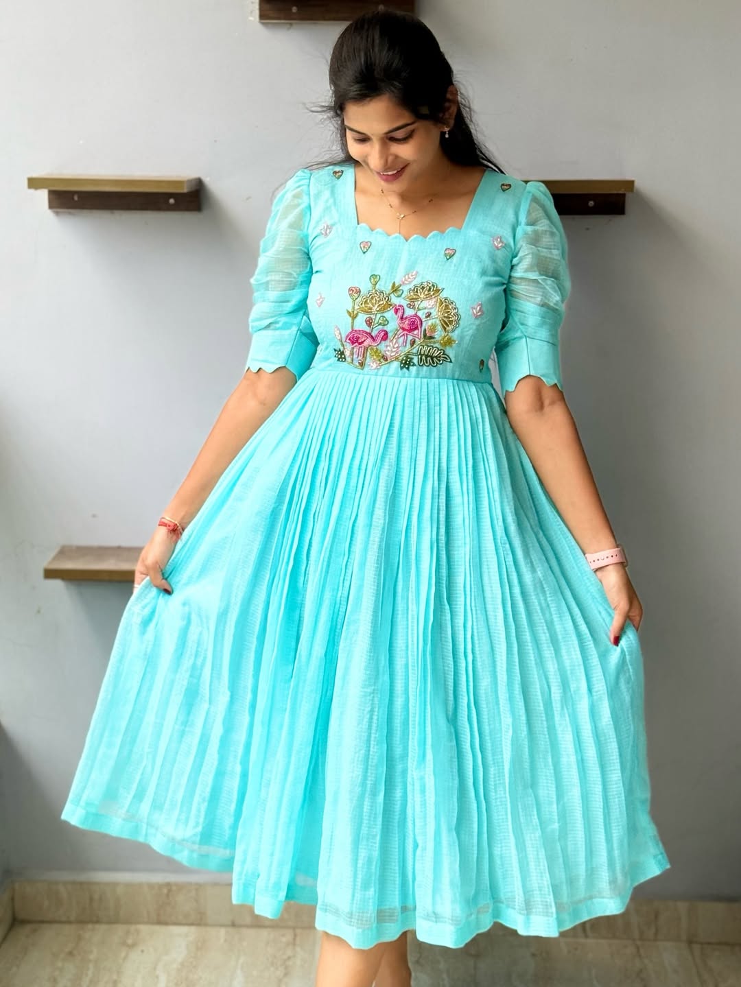 Varsha sea blue kota chex hand-work frock for women.